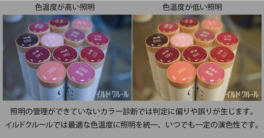 イルドクルールのサロンの照明(Ra99AAA/非LED色評価用照明)は色温度も最適に管理され、常に一定で本来の色に最も近い色を眼の前で見せてくれます。
